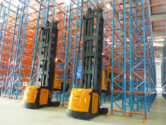 高位立體貨架,也稱爲重型貨架,高度可以做到12米高,用窄巷道叉車上下貨物,