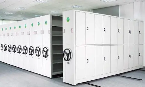 移動(dòng)密集架下方有導(dǎo)軌,搖動(dòng)手柄,密集架可以在導(dǎo)軌商移動(dòng),密集架
