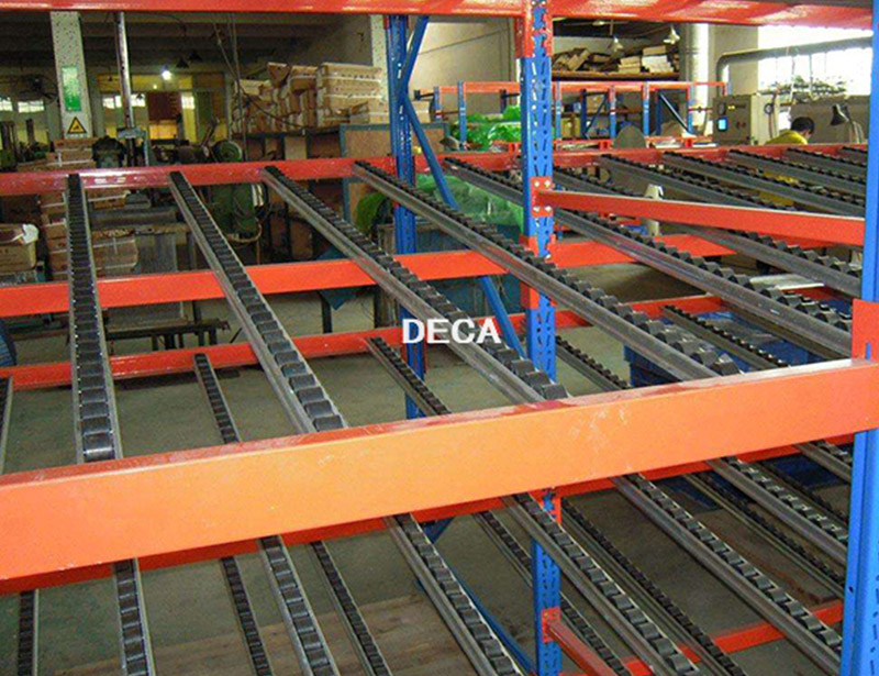 流利式貨架特性:流利式貨架通常由中型橫梁貨架演變而來,每層前後橫梁之間以一定的坡度(約3°)放置滾輪式鋁合金或流利條。貨物通常用紙包裝或放在幹燥的塑料周轉箱中,貨物的流動和先進先出是通過自身重量來實現的。單位貨架每層荷載一般小於1000kg,流利式貨架高度小於2.5m。